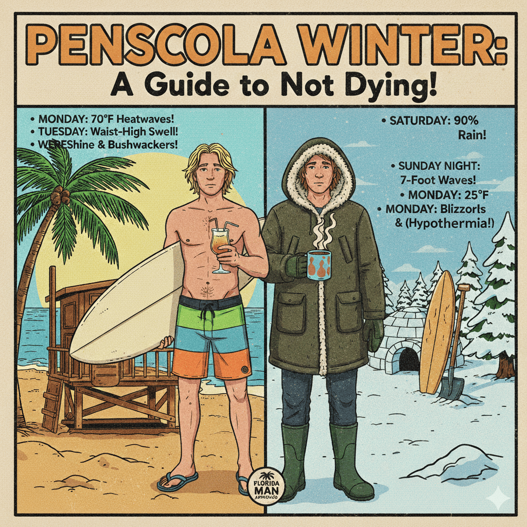 Grab a light jacket, an umbrella and keep the sunscreen handy, and let’s dive in. Right now, the surf in Pensacola is waist-high and "sloppy" with a 70°F air temp. The Gulf is sitting at 62°F, a temperature that will make you retreat faster than a tourist during a shark sighting. A massive cold front is about to kick the waves up to 7 feet by Sunday evening just in time for the air to hit a frost-biting 25°F.