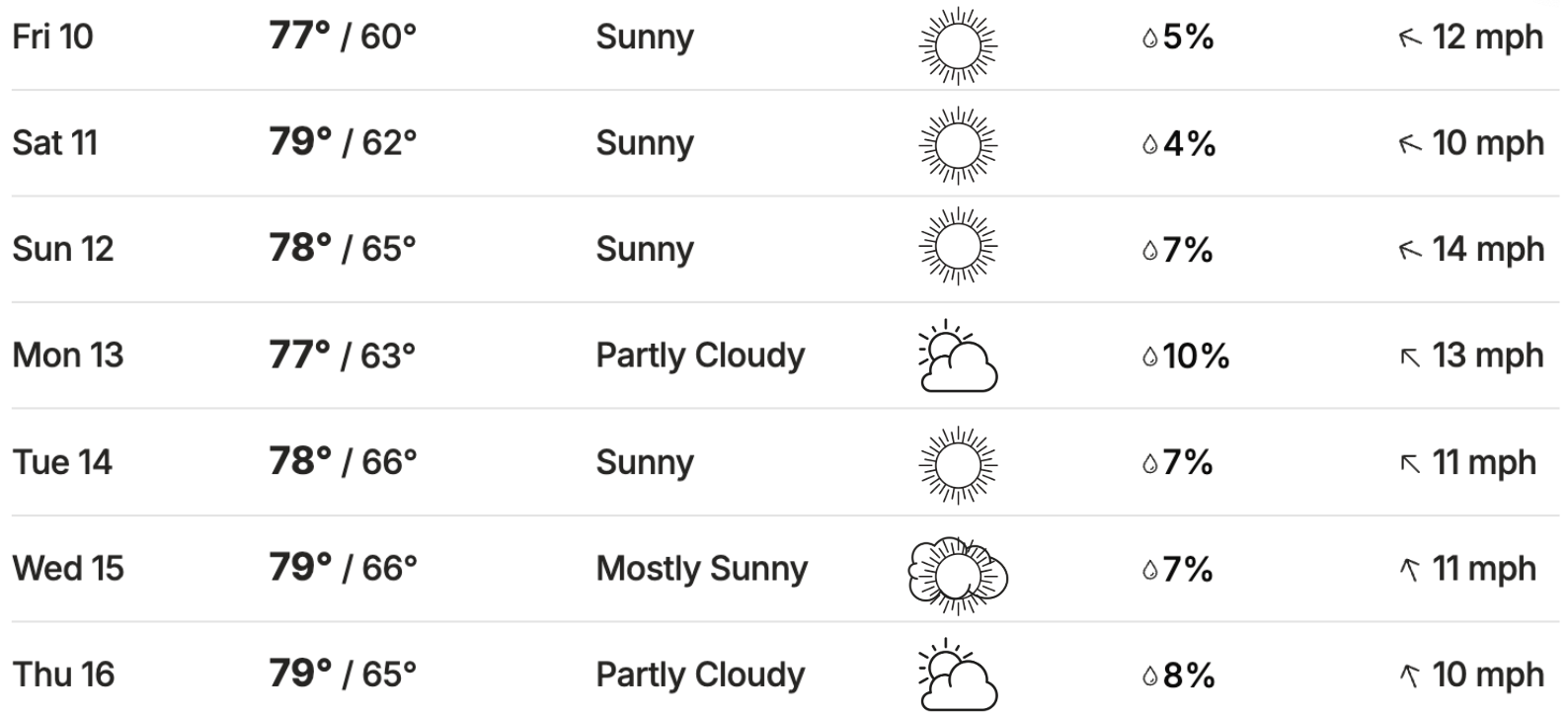 When the sun goes down, it'll settle into a comfortable range between 62°F and 67°F, making for a mighty fine evening everyday. Itās a beautiful week to be out and about!