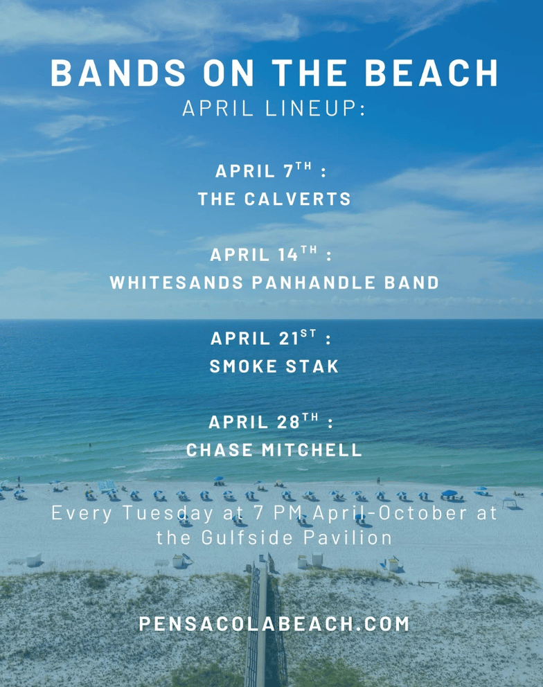 Bands on the Beach features the Whitesands Panhandle Band from 7:00 PM to 9:00 PM at the Gulfside Pavilion on Pensacola Beach.